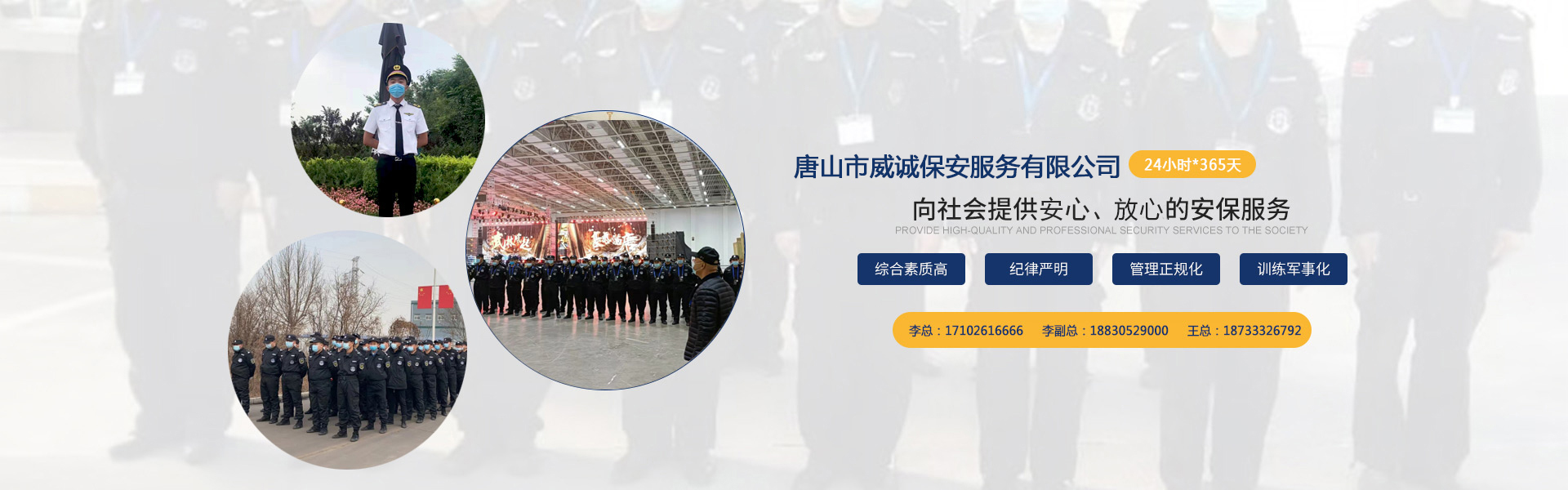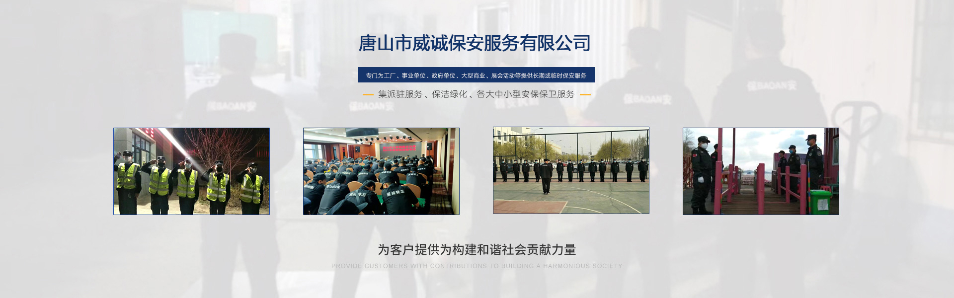 唐山市威誠保安服務有限公司自成立以來以“嚴防死守、忠于業主”為服務原則,以“客戶滿意、 合作共贏”為根本目標。以科學的管理、多方位多層次的服務,建立了首問責任制,完善了走訪、回訪 、滿意度調查、末位淘汰的預警管理,不斷提高服務質量,提高業主滿意度,提高企業形象。秉承“誠 實守信,紀律嚴明,團結協作,致精致誠”的服務理念,為客戶提供高品質、多方位、專業化的保安服務。 本公司制定了嚴謹的定向招生、崗前培訓、考核錄用、崗中培訓、持續培訓、末位淘汰制等一整套完善的管理體系??梢愿鶕蛻舻囊髮嵉乜辈煸u估,以量身定做的方式提供安保防范服務。